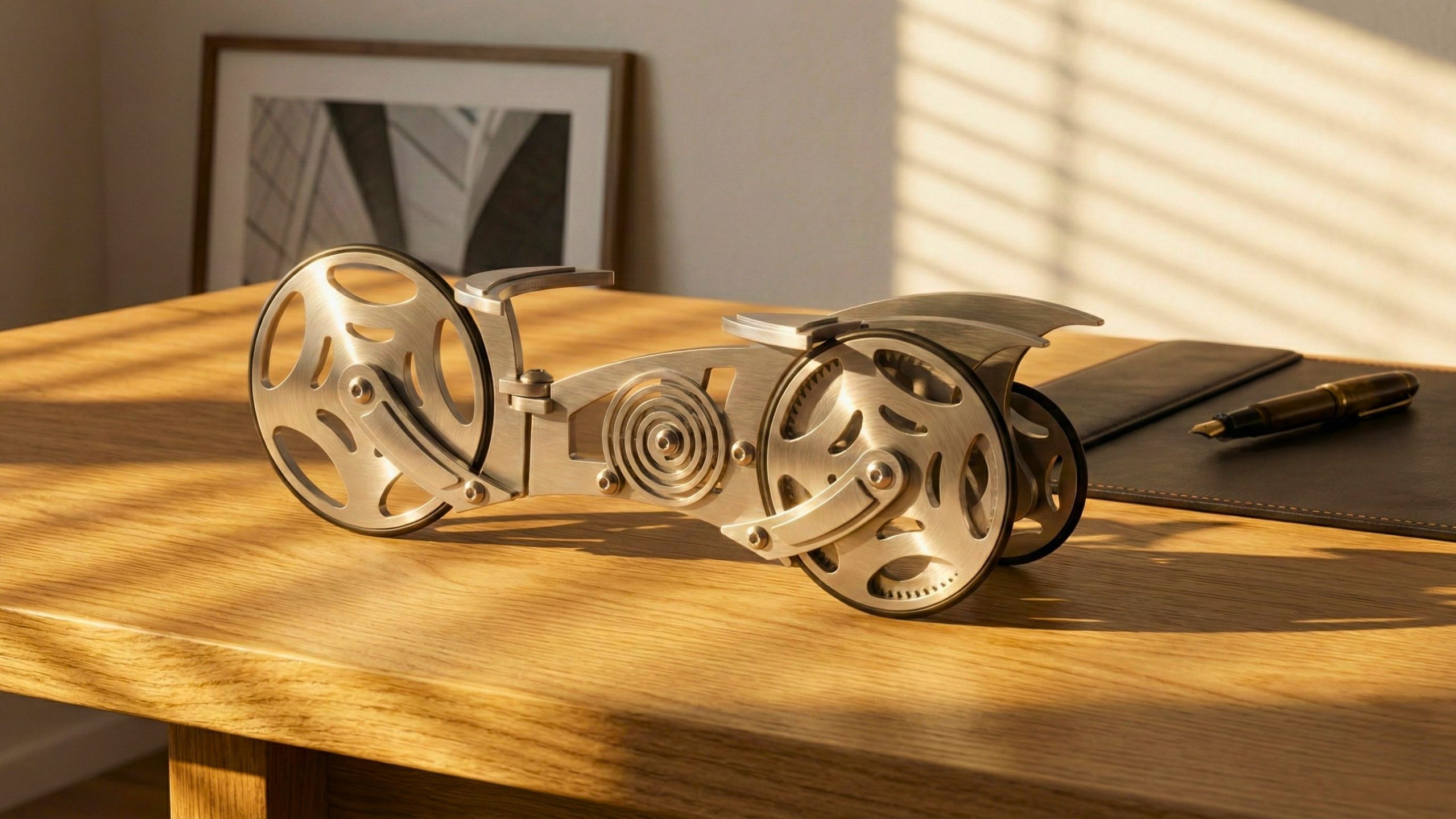 Marrying the visionary propulsion theories of the Renaissance, with the uncompromising power of modern industry, the autocycletm is a study in exclusive mechanical art. This heirloom-quality sculpture features a pristine, bolted architecture that transforms heavy-gauge stainless steel into a commanding statement of timeless elegance.