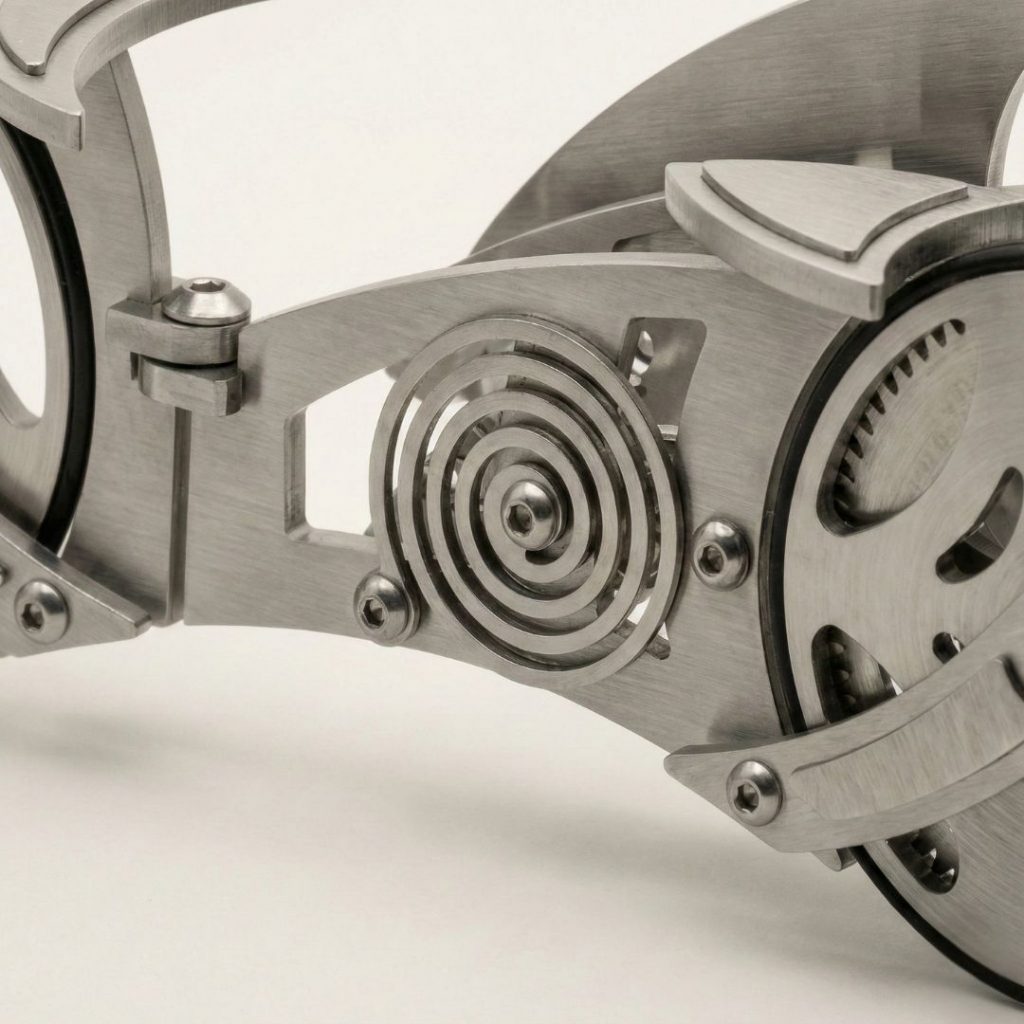 A flash of electric blue disrupts the monochrome silence. Heat-treated to a vivid hue, the spiral springs serve as the visual and mechanical heart that powers the drive with modern intensity.